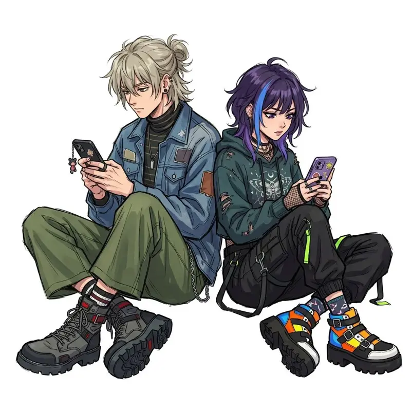 Промпт: Two alternative/grunge style young people sitting back-to-back looking at smartphones, anime illustration