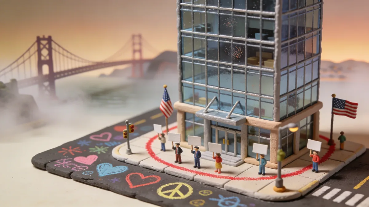 «1, 2, 3, 4, we don't want a robot war!» — скандировали несколько десятков человек у штаб-квартиры OpenAI на Третьей улице в Мишн-Бэй. Протесты против военного AI-контракта компании начались с мела на тротуарах, а закончились митингами, которые освещали BBC и New York Times.